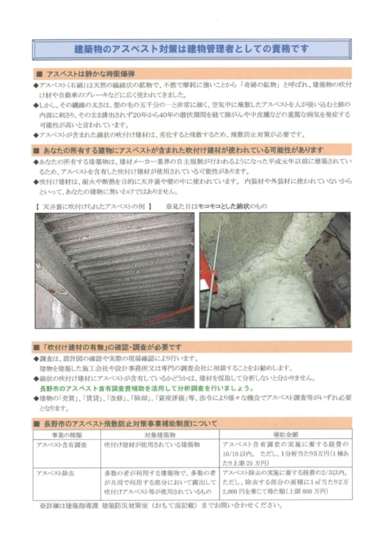 【助成金情報】吹付けアスベストの調査費要