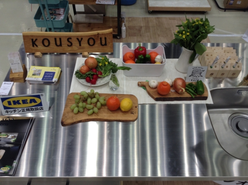 IKEAキッチン アイランド ステンレス天板 オリーブの木カッティングボード