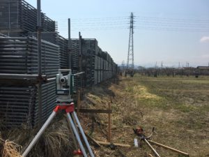 全長200mの長さに成ります、5m間隔に杭と貫でレベルと垂直を出します。天気が良過ぎて150m先は陽炎で見づらい状態でした。