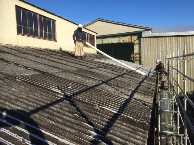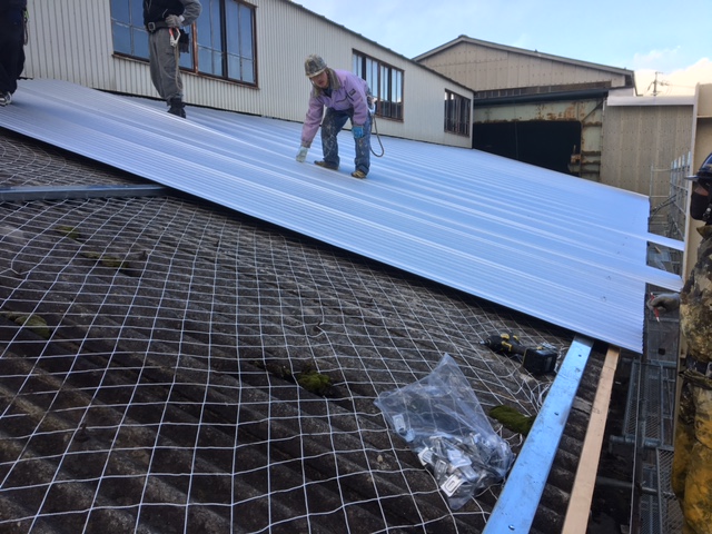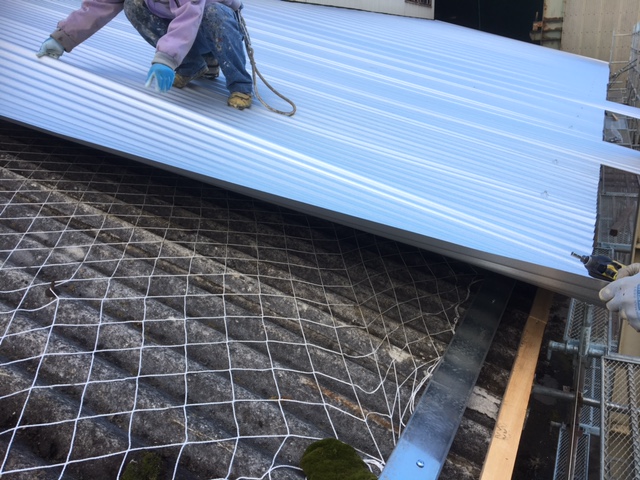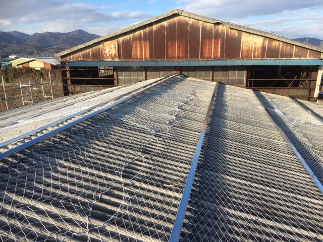 既存スレートの劣化が進んで居るので、安全対策として 屋根全面に落下防止ネットを張り作業を進めました。