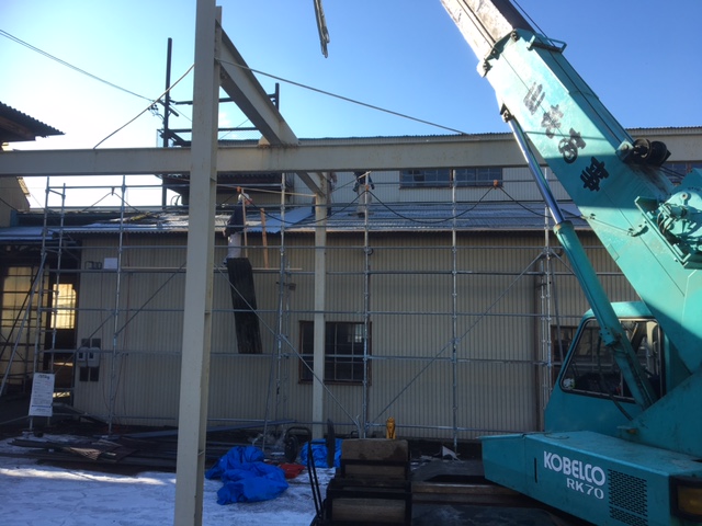通常の大波スレートと形状が違い 直接カバー工法では施工不可なので、C型鋼75 ×45 2.3mm亜鉛メッキ品を既存母屋へ長さ120の鉄板ビスで固定。