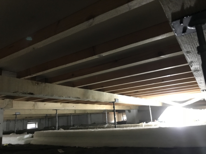 冬場の寒さ対策のためにグラスウール断熱材をキッチンと居間スペースの床下に施工しました。