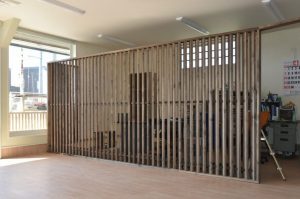 既製品の間柱材 厚み30 mm間隔を45 mm 角度30 度 斜めにすろことから お客様の目線を気にせず お客様の気配は感じます。