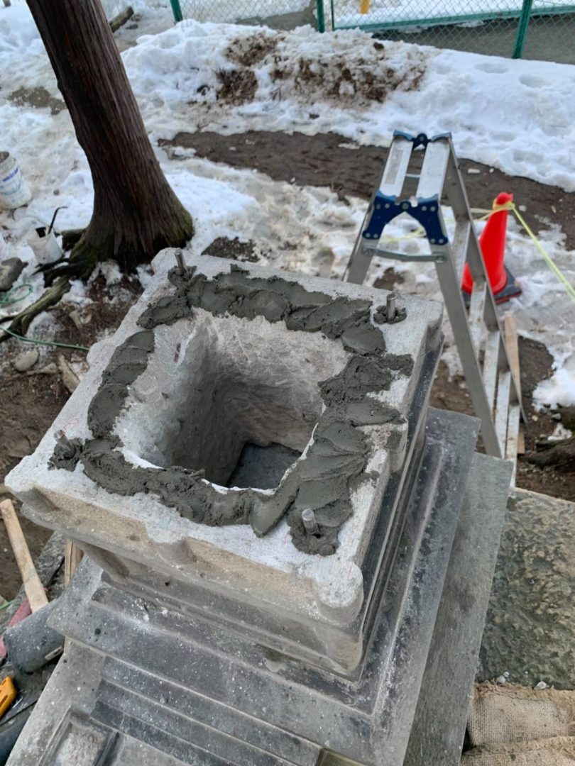 全体を一時撤去して、接地面にステンレス系アンカーを固定 無収縮モルタルで目地詰め固定を行いました。