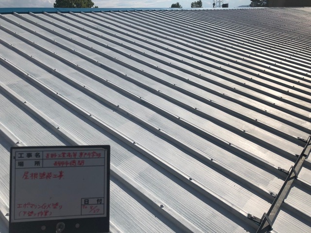 FRP素材の屋根に ケレン作業 高圧洗浄 下地処理エポキシ系エポマリンを塗り