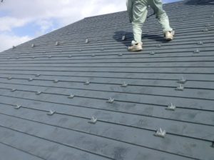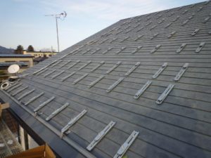 今回のご紹介する工法は、穴を開け無いで屋根材につかみ金具で固定します。