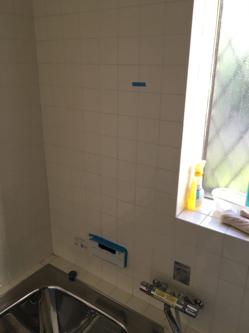 壁がコンクリート下地・タイル仕上げであるため、樹脂プラグを壁に打込み、付属のビスで固定をしました。
